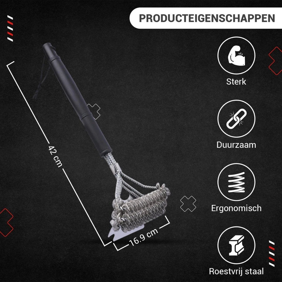 Het borsteltje gaat lang mee door het stevige ontwerp met spiraalvormig gaas. Door de ergonomische grip ligt de barbecueborstel fijn in de hand. Met de roestvrijstalen schraper kun je alle resten vuil en vet makkelijk en snel van de BBQ verwijderen. De lange steel voorkomt dat je je handen verbrandt.