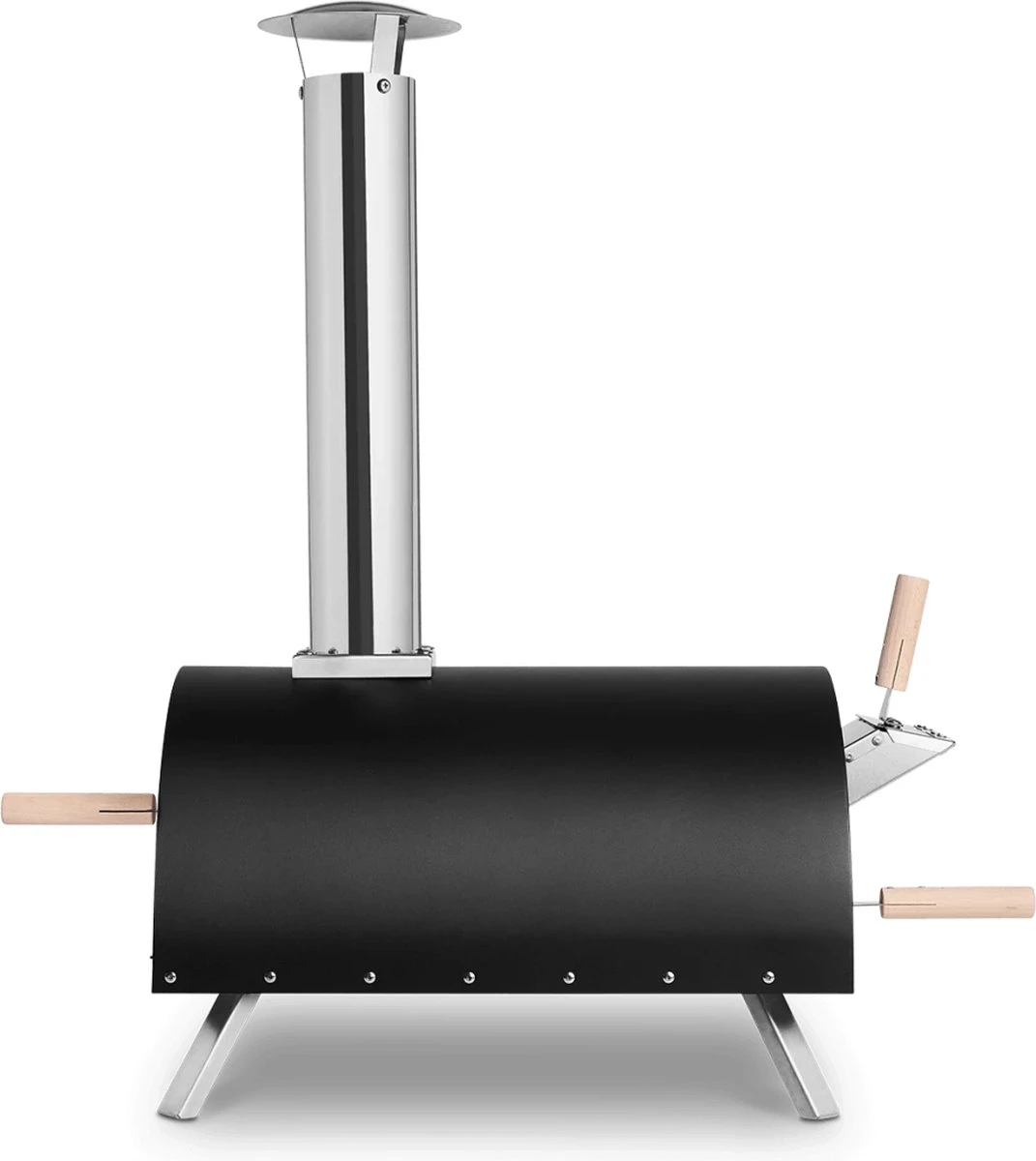4 inklapbare roestvrij stalen voeten, geïntegreerde thermometer (°C en °F), dubbele roestvrijstalen ommanteling, gevuld met wol, Schoorsteen met regenbescherming, pizzaschep met lang houten handvat